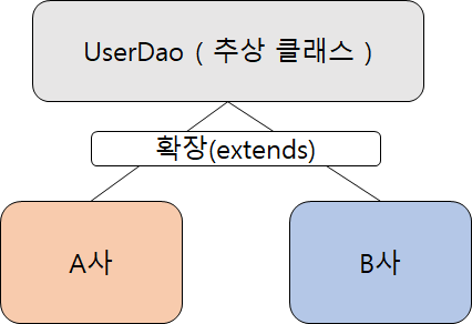 A사와 B사는 자사의 DBMS에 맞는 DB 접근 객체 생성이라는 '관심사'를 위해 UserDao 클래스를 상속했다. 이는 한 가지 관심사를 위해, 3가지 이상의 다른 관삼사를 가진 클래스를 상속한 꼴이 된다. 한 가지 관심사를 위해 다른 관심사가 희생된 것이다.