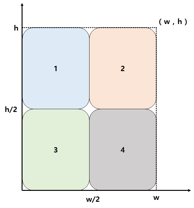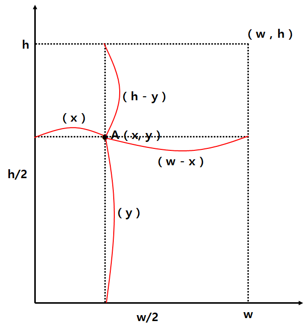 직사각형을 네 부분으로 나눈 후, A점이 어느 영역에 속하는지 판단하는 방식으로 풀었다. 그러나 이 방식은 비효율적이다. A지점부터 최소거리가 가능한 값들을 구체적으로 파악하지 않고 범위를 나누어 푸는 알고리즘을 적용하였다. 범위를 사용하니 조건판단문이 많아져 효율적이 코드를 작성하지 못했다.