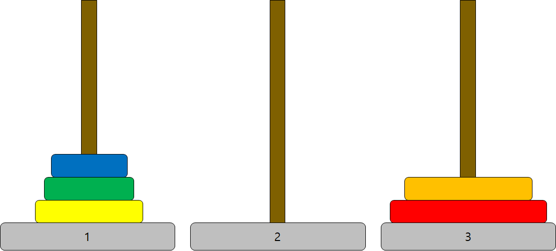 그럼 이제 2번에 쌓여있는 원판들을 3번으로 옮기면 된다. 빨간색 원판은 이미 옮겨졌으니 제외하자. 그러면 가장 큰 원판은 주황색 원판이 된다. 주황색 원판을 2번에서 3번으로 옮기려 한다. 그렇다면 나머지 원판들은 1번에 차곡차곡 쌓여있어야 한다. 그래야 2번에서 3번으로 주황색 원판을 옮길 수 있다.