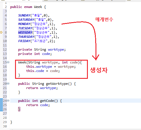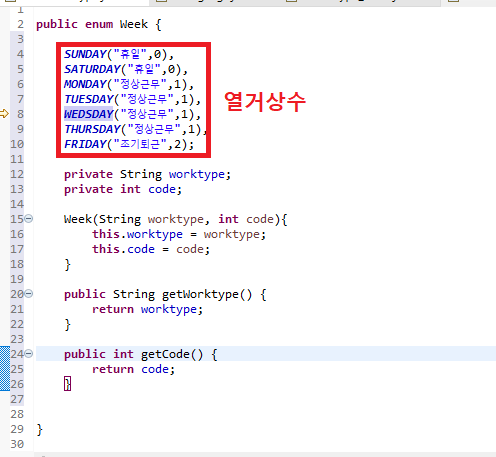 메소드 영역의 열거상수를 통해 값이 생성자의 매개변수로 넘어간다. 그리고 생성자에 의해 Heap 영역에 객체를 생성한다. Heap영역에 Sunday ~ Friday 까지 7개의 객체가 생성되고 각 객체는 worktype, code 필드와 getWorktype(), getCode() 메소드를 갖는다.