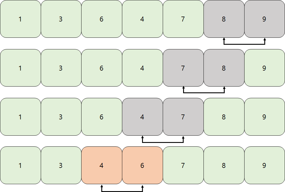 버블정렬은 우측 끝부터 두 수를 비교하는 방식이다. 그래서 포인터가 우측에서 좌측으로 이동하면서 두 수를 비교하여 작은 값을 좌측으로 교환한다.(오름차순)