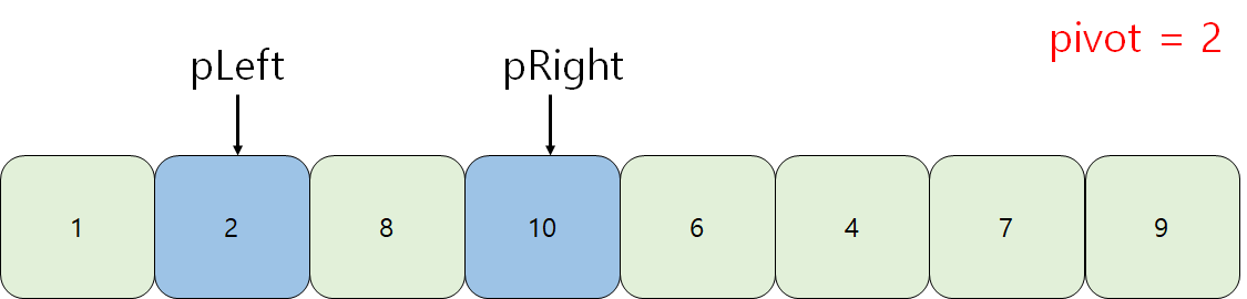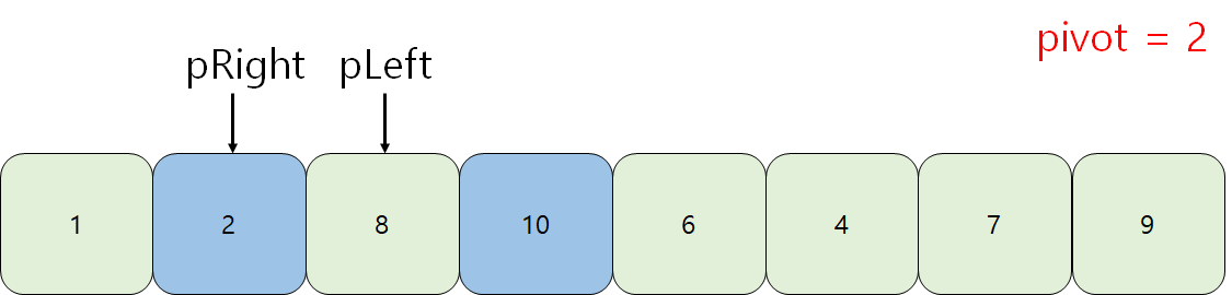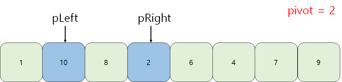 4. 해당 과정을 반복하되 pLeft가 pRight보다 커지면 교환을 중단한다.