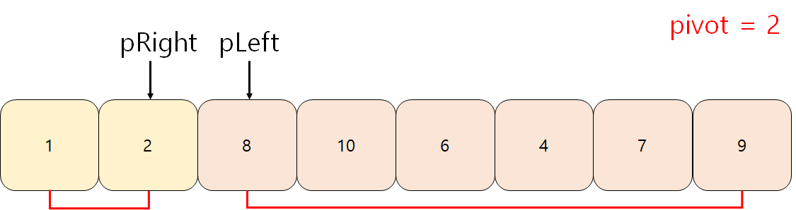 5. 좌측끝 ~ pRight 까지는 pivot보다 작은 수로 pLeft ~ 우측끝은 pivot보다 큰 수로 채워진다.