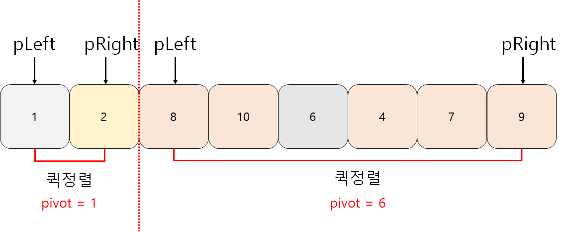 퀵정렬은 pivot보다 작은 구간과 큰 구간으로 나눈 후 다시 퀵정렬을 구간별로 진행하는 방식이다. 재귀는 pLeft와 pRight를 매개변수의 인수로 받아 퀵정렬을 하였다. 재귀를 사용하지 않을거면 pLeft와 pRight를 저장할 별도의 공간이 필요하다.