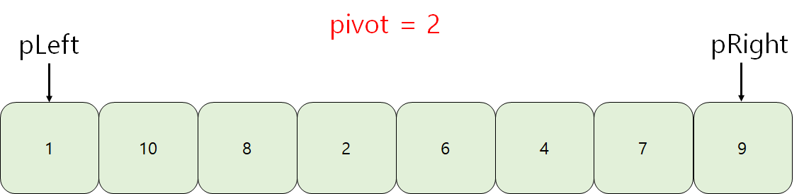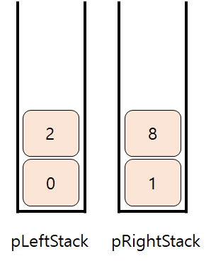 길이가 8인 배열이다. pLeft와 pRight는 0과 8이고 pivot은 2이다. 두 가지 스택을 만든다. 하나는 pLeft 용 스택, 다른 하나는 pRight용 스택이다. 첫 pLeft와 첫 pRight의 값은 배열은 처음과 끝인 0과 8이다. 첫 시작은 아래와 같다.