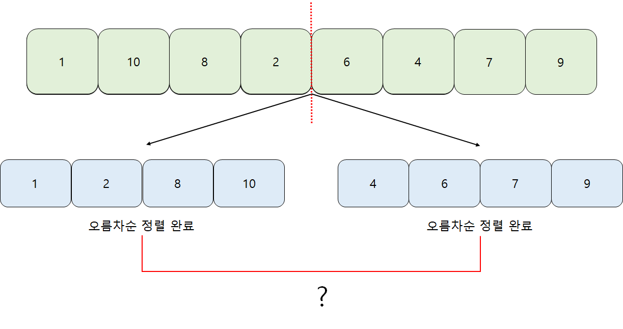 퀵정렬은 pivot을 기준으로 좌측과 우측을 나누었다. 그래서 좌측에 있는 수는 이미 우측에 있는 수보다 작은 수이다. (오름차순) 그러나 합병 정렬은 기준없이 중간지점에서 구간을 둘로 나누었다.