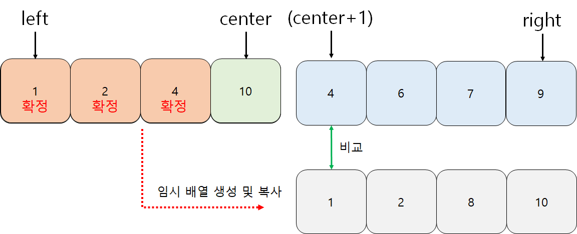 원리는 간단하다. 서바이벌 방식이다. 우선 임시 배열을 하나 생성하여 좌측구간을 복사한다. 그리고 우측구간과 임시배열을 첫 번째 값부터 하나씩 비교한다. 1과 4를 비교하면 1이 작다. 그러므로 배열의 첫 번째 자리는 1의 차지이다.