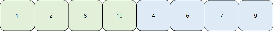 그래서 좌측구간이 우측 구간보다 작지 않다. 그러므로 퀵정렬처럼 그냥 합쳐지면 정렬이 되지 않는다. 그러므로 별도의 알고리즘으로 정렬을 완성해야한다.