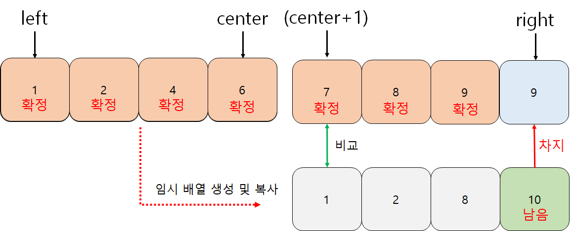 // 그러나 임시배열은 남은 구간에 데이터를 넣어주어야 한다.