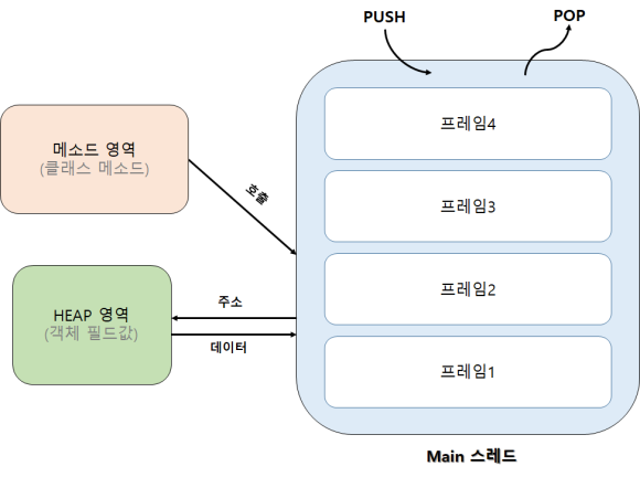 객체의 메소드는 Heap영역에 저장되지 않는다. Heap 영역에는 객체의 필드값이 저장된다. 스레드에서 메소드를 '. 도트 연산자'를 통해 호출하면 스레드 안에는 '프레임(frame)'이 형성된다.