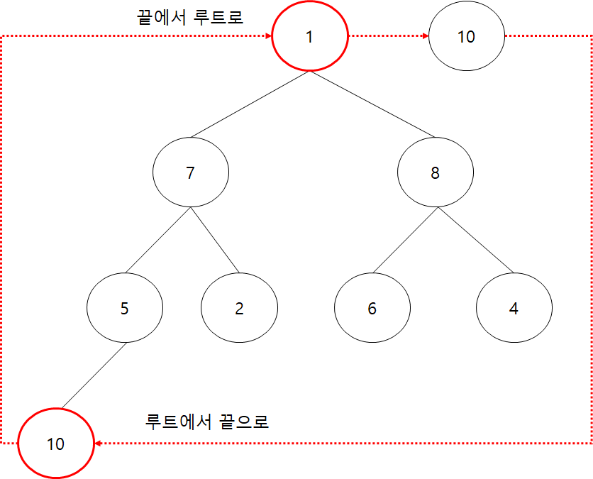 전혀 힙의 조건을 만족하지 않는다. 그러므로 조건에 만족하도록 부모와 자식 간의 대소를 비교하여 위치를 바꾸어주어야 한다.