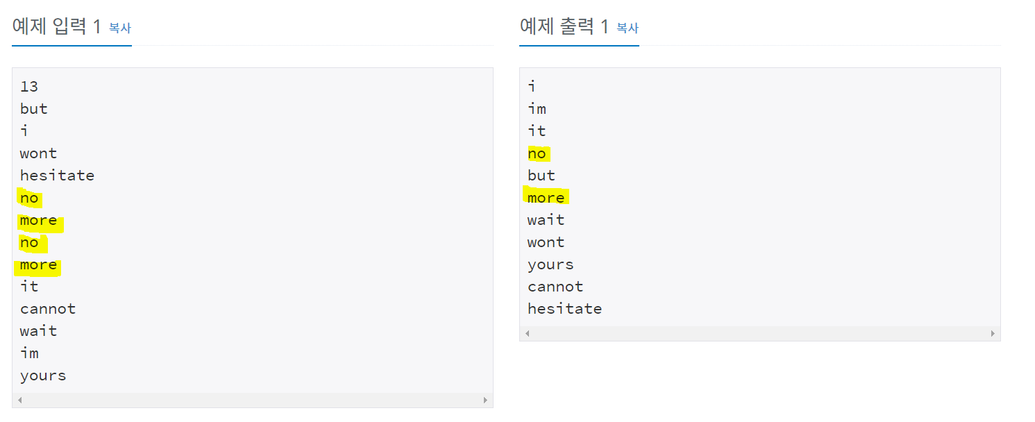 예제를 보면 동일한 단어를 입력받으면 출력시, 중복을 제거해주는 것을 확인할 수 있다. 중복제거를 위해 HashSet 자료구조를 사용한다.
