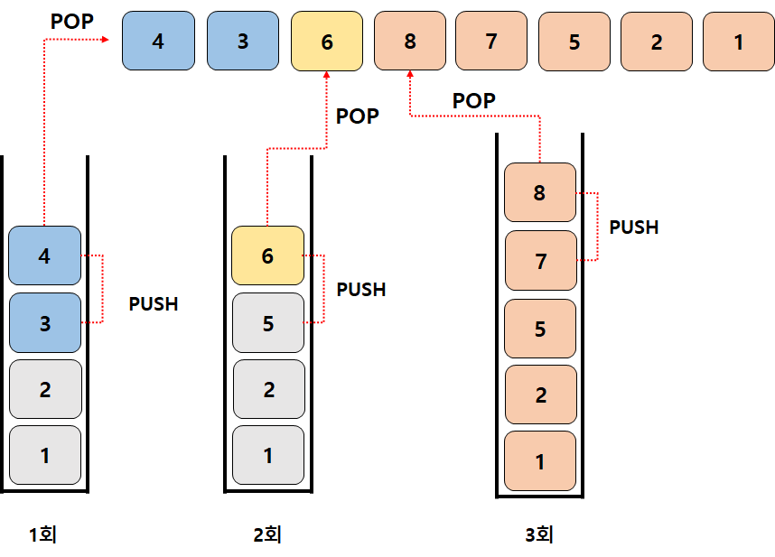 이제 POP할 차례다. 수열과 스택의 TOP을 하나씩 비교하여 POP한다.