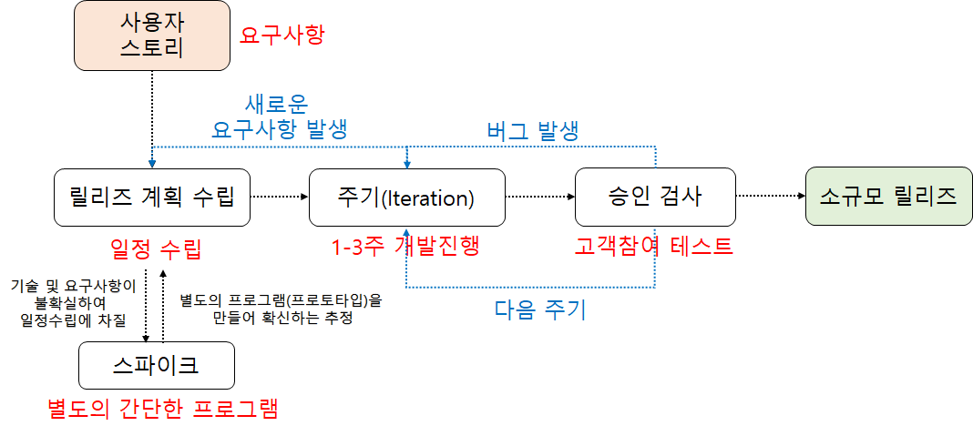 요구사항 변화에 민첩하게(agile) 대응하도록 일정한 주기를 반복하며 개발하는 모형