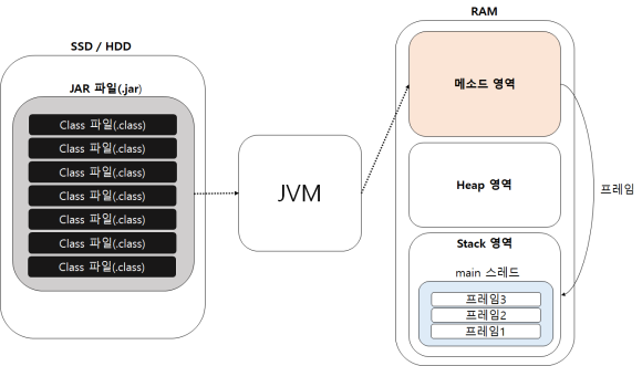 JAVA는 C와 달리 SDD / HDD 와 RAM 사이에 JVM이 껴있다. C언어는 위쪽 부터 아래로 쭉 코딩을 하면 컴파일러는 위부터 아래까지 쭉 읽고 실행파일을 만든다. 이를 실행하면 위부터 아래까지 쭉 한번에 RAM의 코드 영역에 적재시킨다.