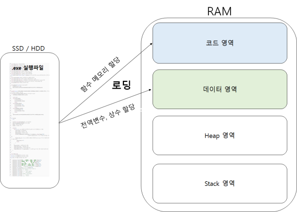 C는 프로그램이 RUN되기 전에 C 실행파일을 위부터 아래로 쭉 읽으며 함수를 코드 영역 메모리에 미리미리 적재한다. 이렇게 저장된 코드들은 나중에 CPU 명령어가 된다. CPU에게 명령을 내려 연산을 지시하면 CPU는 RAM에서 적절한 데이터를 갖고와 명령에 맞게 ALU 같은 연산회로를 돌린다.