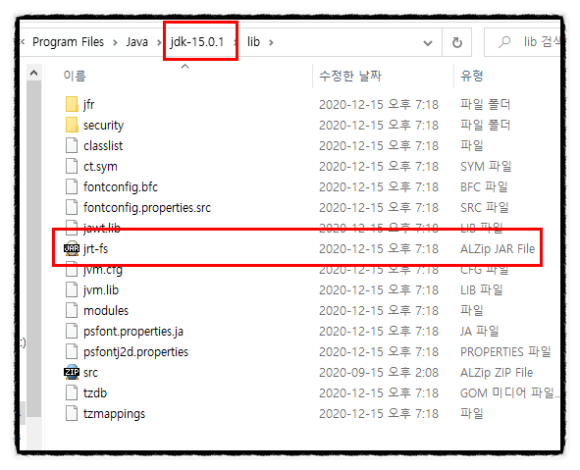 JDK 폴더를 들어가 보면 jrt-fs.jar 파일이 있다. 우리가 JAVA 코딩을 하는데 필요한 기본적인 클래스들을 JDK에서 미리 지원해주는 것이다. 우리가 System.out.println(); 코드를 사용할 수 있는 이유도 여기에 있다.