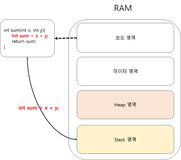 프로그램이 실행(Run)되면 Stack 영역에 변수를 할당해야한다. 코드 영역에 이미 변수에 대한 정보가 다 들어있다. int sum = x+y; 이면 stack영역에 int형 4byte 메모리를 할당하고 그 안에 x+y의 결과값을 넣는다. 이렇게 프로그램 시작 전에 크기부터 값까지 모든 사항이 '결정'되어있는 것을 '정적 할당'이라 부른다. Stack 영역은 이미 정해진 데이터들을 저장하는 목적의 메모리 영역이다. Heap 영역은 이와 반대다.