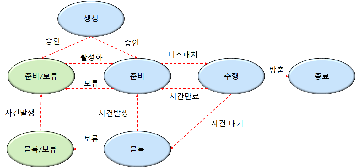 수행 : 단일처리기를 가정할 때 한 가지 프로세스만이 수행상태이다.