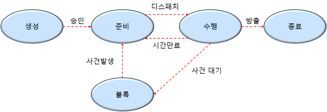블록/대기 : 입축력 인터럽트 등이 발생하면 블록이 된다. 인터럽트 완료 이벤트(사건)가 발생하면 다시 준비상태가 된다. 문맥을 유지해야 되기에 메모리에 존재한다.