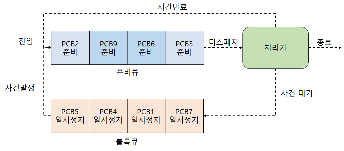 5-상태 모델은 위와 같이 블록큐를 구현한다. 이벤트(사건)가 발생하면 블록큐에 대기하던 이벤트를 준비큐로 진입시킨다. 그러나 이벤트(사건)는 다양하다. 프로세스는 다양한 이유로 인터럽트되어 블록큐에 들어간다. 특정 이벤트(사건)가 발생하면 블록큐를 스캔하여 해당 사건으로 블록된 프로세스를 찾아야 하는 오버헤드가 발생한다. 이를 해결하기 위해, 사건 별로 블록큐를 둔 멀티 블록큐 구조를 구현하여 스캔으로 인한 오버헤드를 줄일 수 있다.