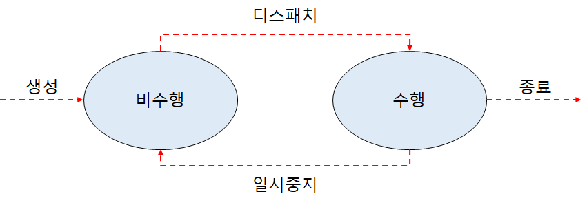 프로세스 상태는 기본적으로 두 가지로 나뉠 수 있다. 수행중이냐 비수행중이냐. 지난 포스팅에서 다루었던 바와 같이, OS는 PCB 자료구조로 프로세스를 관리한다. 준비큐에 PCB가 대기하면 비수행이고 처리기를 할당받으면 수행중이다. OS는 프로세스를 Switch하는 디스패처(Dispachter) 프로그램을 이용하여 처리기를 다른 프로세스에 할당한다.(디스패치)