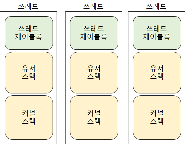 쓰레드는 디스패치의 단위이므로 문맥(Context)가 있다. 그리고 쓰레드를 제어할 쓰레드 제어 블록도 존재한다. 각 쓰레드마다 별도의 스택이 존재하지만 프로세스의 상태와 자원을 공유한다.