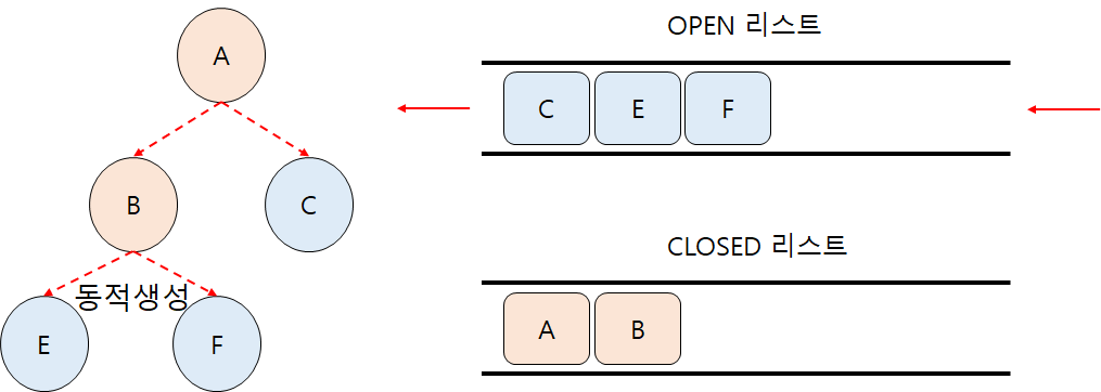 - CLOSED 리스트 : 탐색이 끝난 상태 리스트