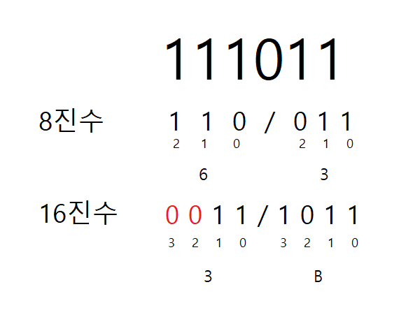 8진수는 3개씩 한 마디 나누고 16진수는 4개씩 한 마디로 나눈다.