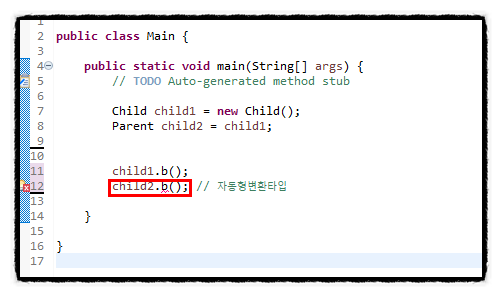 이처럼 서로 같은 객체를 참조하고 있지만 선언된 참조변수의 타입이 달라 표현 가능한 데이터의 범위가 서로 다르다. child2는 부모 타입을 참조변수로 갖고 있기 때문에 부모 클래스에게 상속받은 메소드와 필드만 사용 가능하다. 만약 상속받은 메소드가 오버라이딩되었다면 오바라이딩 된 메소드를 호출한다.