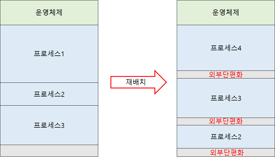 필요한 크기의 메모리를 할당하기에 내부단편화는 발생하지 않지만 프로세스가 재배치(Relocation)되는 과정에서 메모리가 사용되지 못하고 남는 부분이 생긴다.