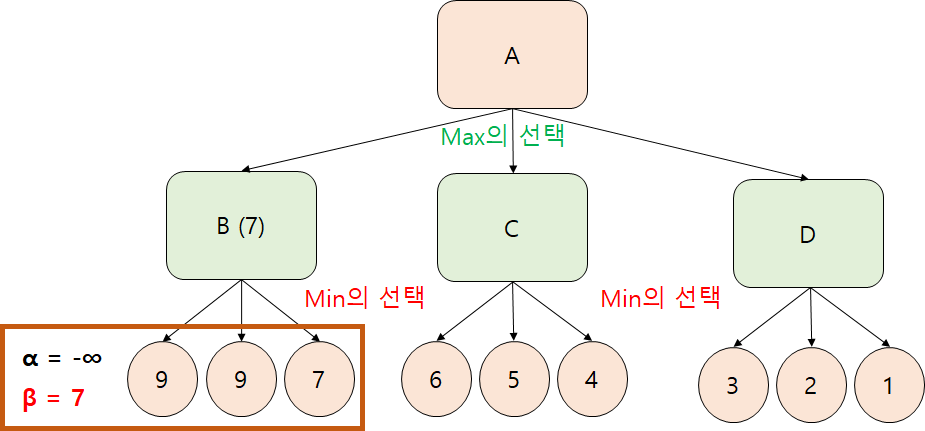 B 노드는 자식노드를 3개 갖고 있다. 이는 Min이 선택해야 할 경우들이다. Min은 항상 작은 값을 선택하므로 7을 선택한다. 고로 β는 7이 된다. 7은 B노드의 값이 된다.