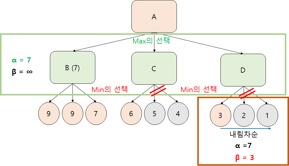 부모노드 세계에서는 Max가 선택권이 있으므로 α가 큰 값이 선택받는다. C 노드는 α값을 넘겨줘 자식노드들이 β값과 비교하도록 한다. β가 α보다 작으면 탐색이 무의미해지기 때문이다. 자식노드는 좌측부터 내림차순으로 정렬되어 있다. 맨 좌측값이 부모로부터 받은 α보다 작으면 나머지 자식노드는 탐색이 쓸모 없어진다. 자식노드의 β값이 곧 C노드의 α값이 되지만 7보다 작으므로 Max의 선택을 받지 못한다. 고로, 탐색을 중단하고 '가지치기'한다. (Pruning)
