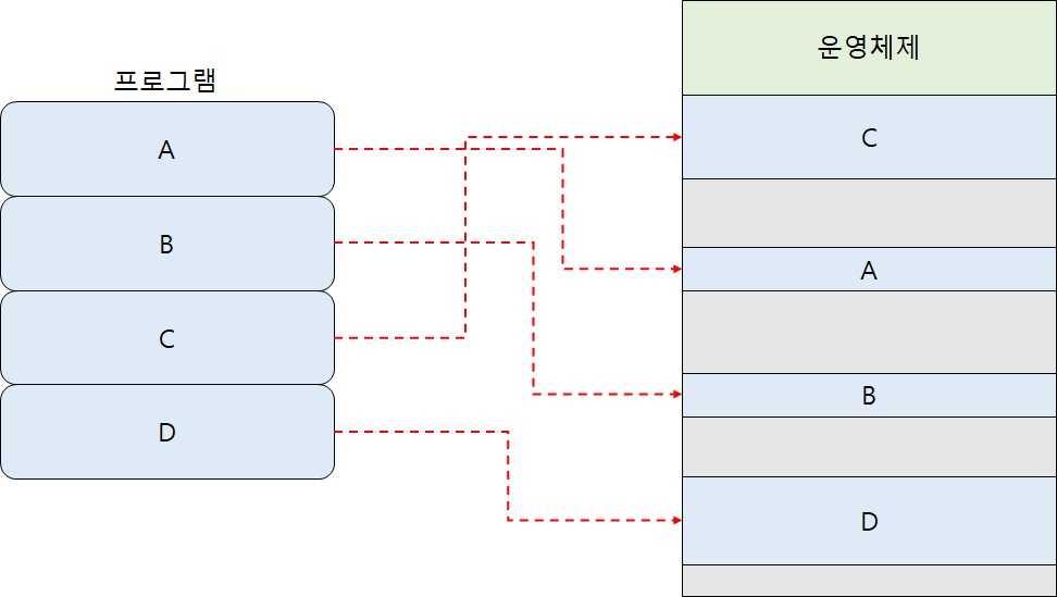 비연속 메모리 할당은 프로그램의 코드가 메모리에 비연속적으로 할당되는 방식을 의미한다.