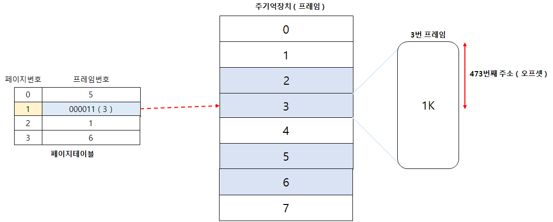 오프셋은 10bit이므로 총 1024가지 주소를 표현할 수 있다. 이를 1K라 부른다. 페이지와 프레임을 1K 크기로 동일하게 잘랐다. 이제 상세주소를 계산해보자. '0111011001'은 '473'이다.