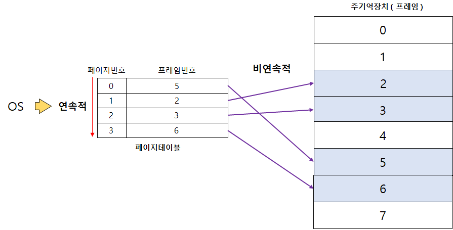 OS는 물리적으로 비연속적이게 저장된 데이터를 페이지테이블을 통해 연속적으로 접근할 수 있다.