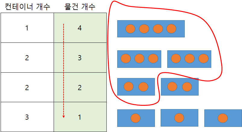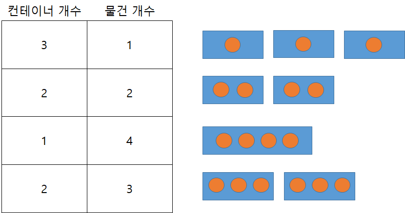 예제 ) 트럭에 4개의 컨테이너만 실을 수 있을 때, 최대 몇 개의 물건을 실을 수 있는가?