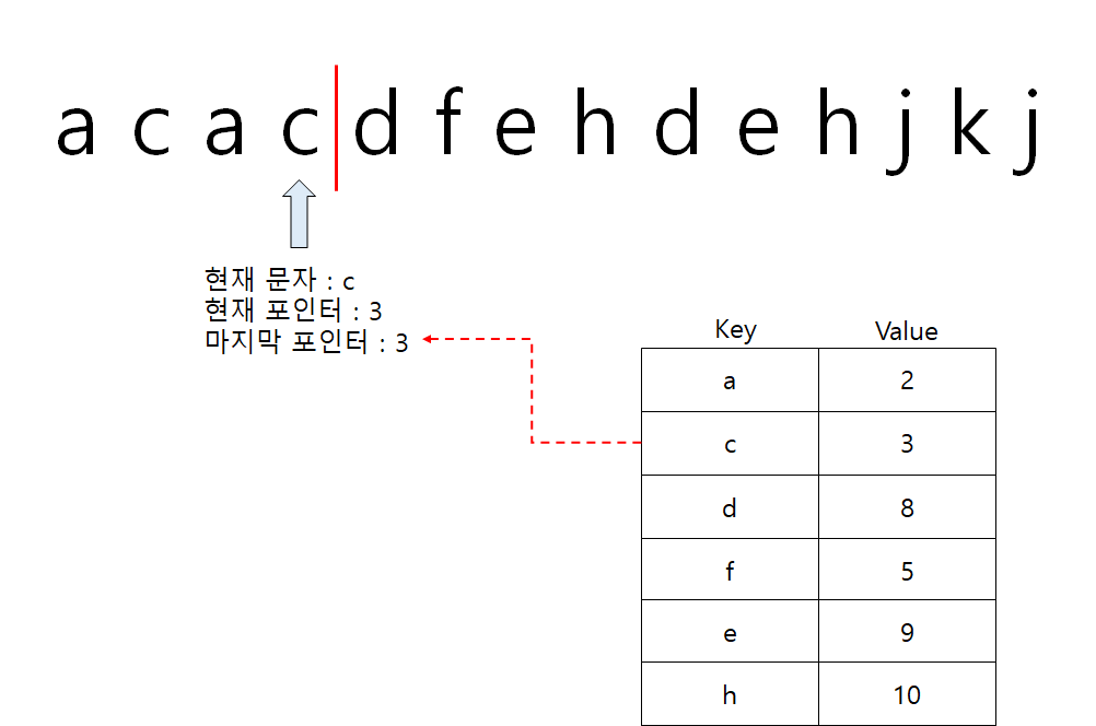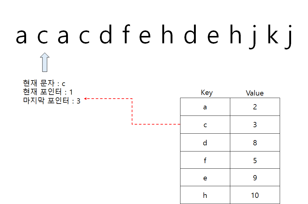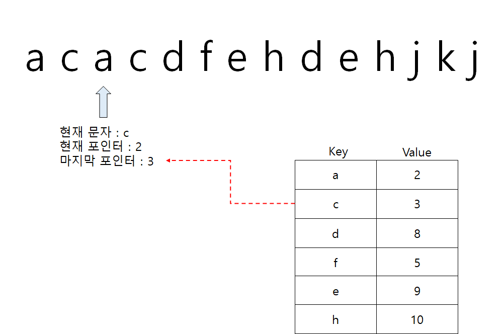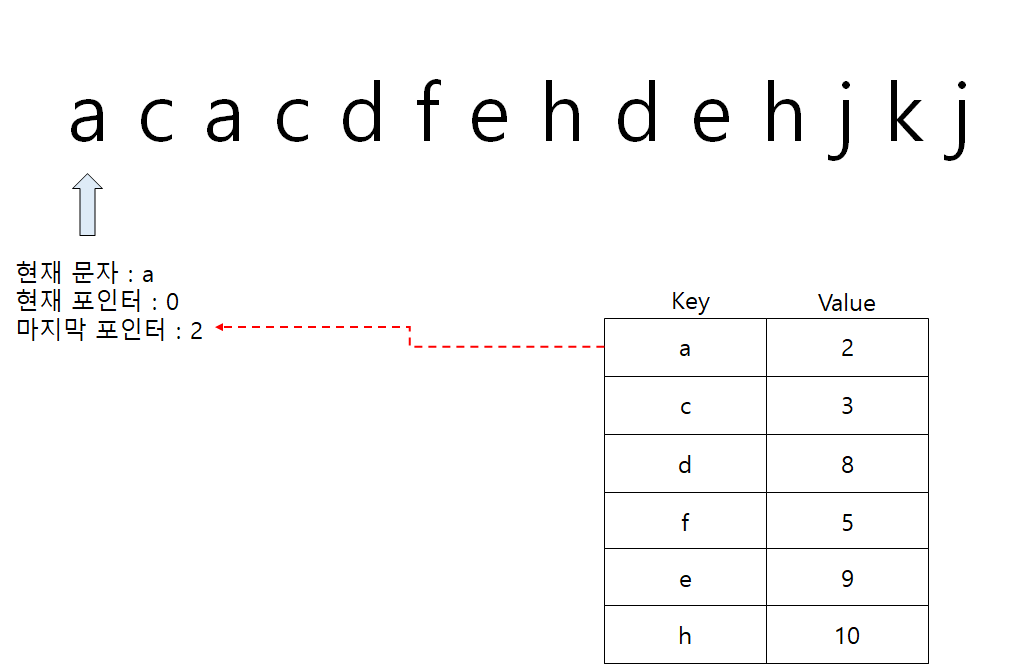 그럼 마지막 포인터 정보를 알아야한다. 반복문을 돌려 문자열의 문자를 하나씩 체크한다. 문자의 마지막 인덱스가 무엇인지 HashMap 자료구조에 저장한다.