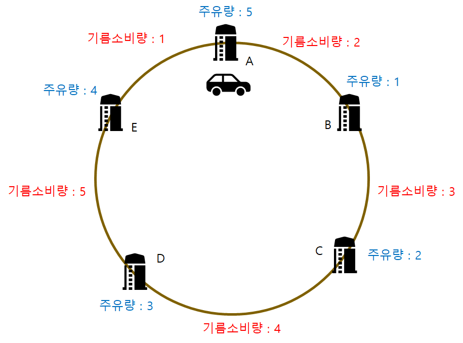 예제) 원을 따라 주유소가 다섯 곳이 있다. 주유소마다 주유할 수 있는 기름양은 다르다. 자동차는 한 곳의 주유소를 선택하여 주유를 한 뒤 이동한다. 주유소를 거칠 때 마다 주유소에서 제공하는 기름양만큼 주유가 가능할 때, 자동차가 원 한 바퀴를 돌 수 있으려면 어떤 주유소에서 출발해야 하는가?