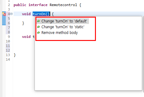 이클립스는 인터페이스가 일반적인 메소드를 생성하는 것을 막는다. 인터페이스는 유지보수성을 극도로 올리기 위해, 강제성이 강하게 부여된 클래스이다. 위 사진처럼 메소드를 일반적으로 정의하면 에러가 난다.