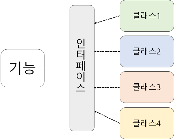 그러므로 중간에 인터페이스를 둔다. 인터페이스가 기능과 클래스 사이에서 소통을 중재한다. 인터페이스는 구현을 담당할 클래스들에게 '표준'을 제시하고 구현 클래스들은 표준대로 오버라이딩을 해서 구체화한다.