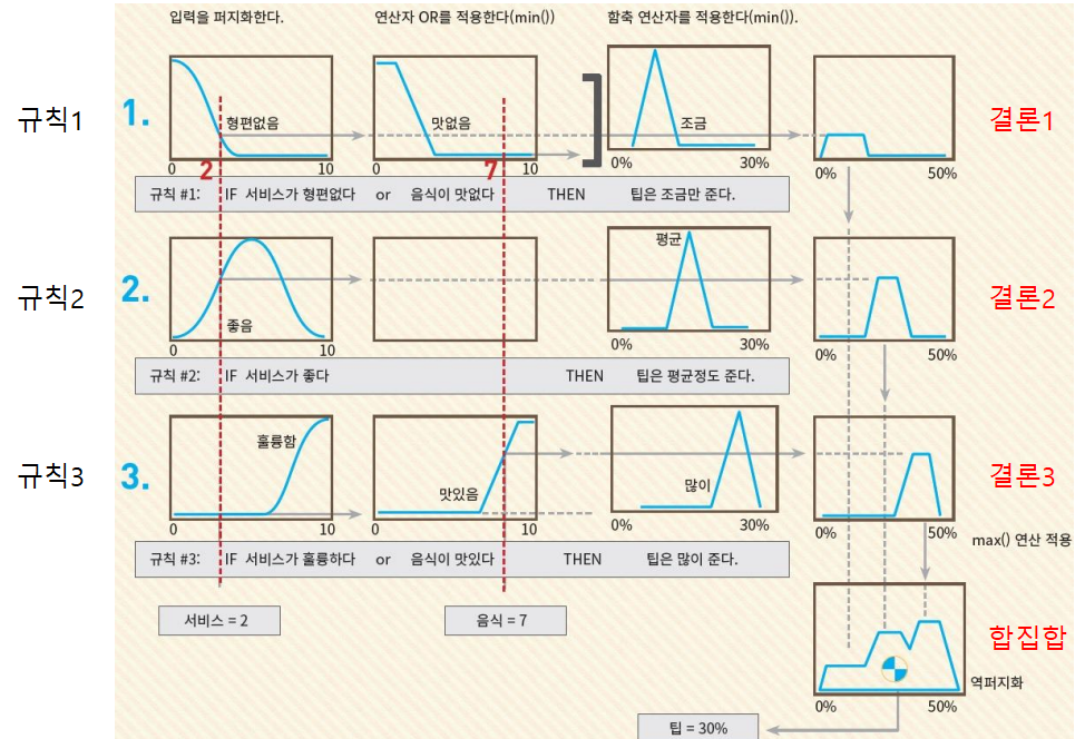 규칙이 여러 개면 결론도 여러 개다. 하나의 규칙은 Max-Min 추론을 통해 역퍼지화하여 퍼지집합을 구한다. 결론이 여러 개이므로 역퍼지화 된 퍼지집합도 여러 개이다. 모든 규칙을 고려해야하므로 퍼지집합 그래프를 합집합 한다.