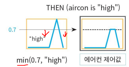 전제의 소속도는 Max 소속도로 최상의 경우이다. 그러므로 Max 소속도로 산출되는 퍼지집합보다 작은 소속도(Min)로 역퍼지화하여 퍼지집합(에어컨 세기)을 구한다.