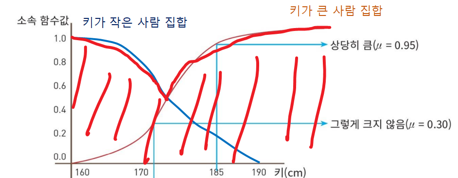 키가 완전 작거나 키가 완전 크면 소속도가 작다. 가장 중간 키가 교집합의 소속도가 가장 높다.