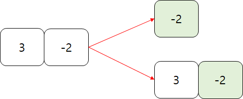 1)에서 다룬 부분수열을 제외하면 부분수열은 두 가지 경우가 있다. 최대곱은 -2이고 최소곱은 -6이다.