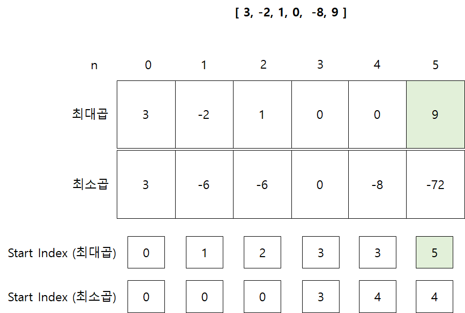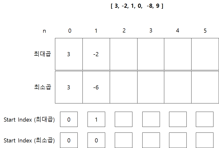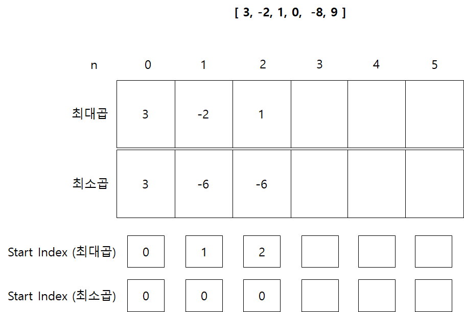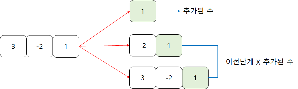 2)는 이전 단계의 최대곱과 최소곱에 추가된 수를 곱하면 최대곱과 최소곱을 구할 수 있다. 1)과 2)를 비교하여 최대곱과 최소곱을 구해준다.