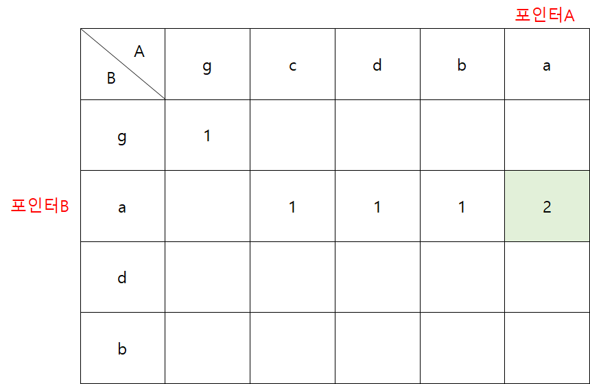 포인터A와 포인터B가 동일한 문자를 가리키므로 LSC는 2가 된다. 두 문자가 동일하므로 두 포인터를 다음 문자로 이동시킨다.
