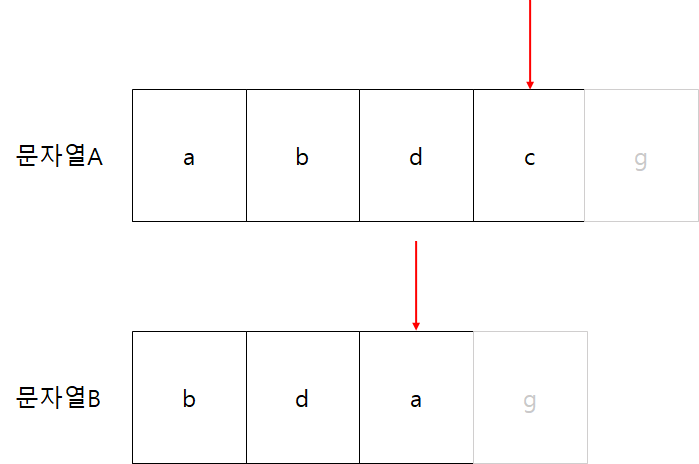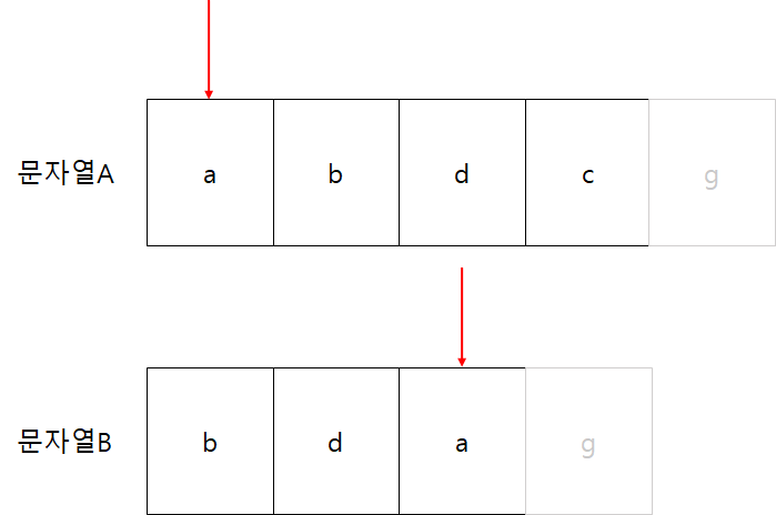 d와 a는 다르다. 그럼 다시 두 가지 선택이 존재한다. 공통된 문자를 찾을 때까지 문자열A 포인터만 이동시켜보자.