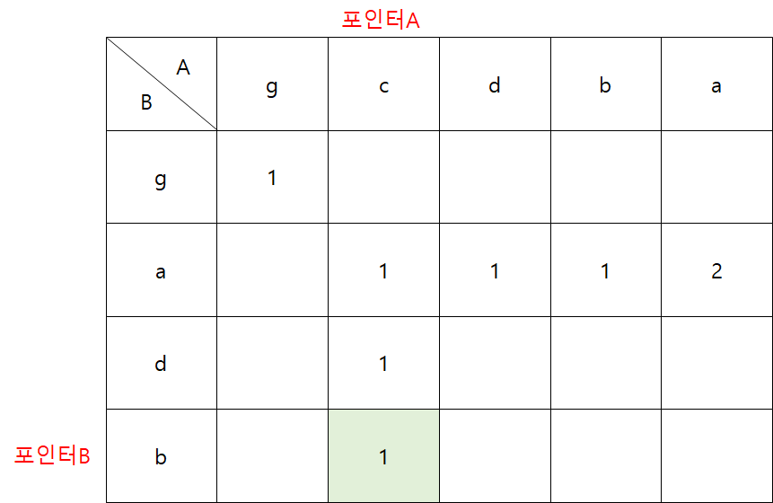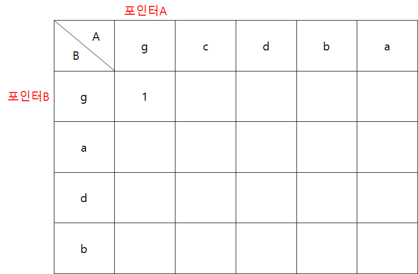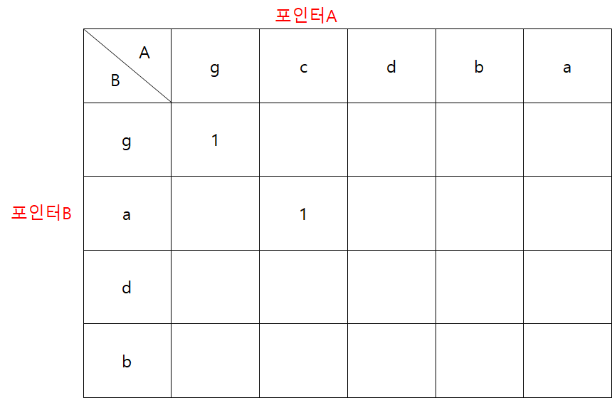 포인터B만 움직였을 때 최종 LCS는 1이 된다. 그럼 포인터A와 포인터B를 번갈아가며 움직여보자.