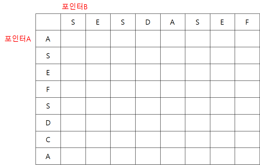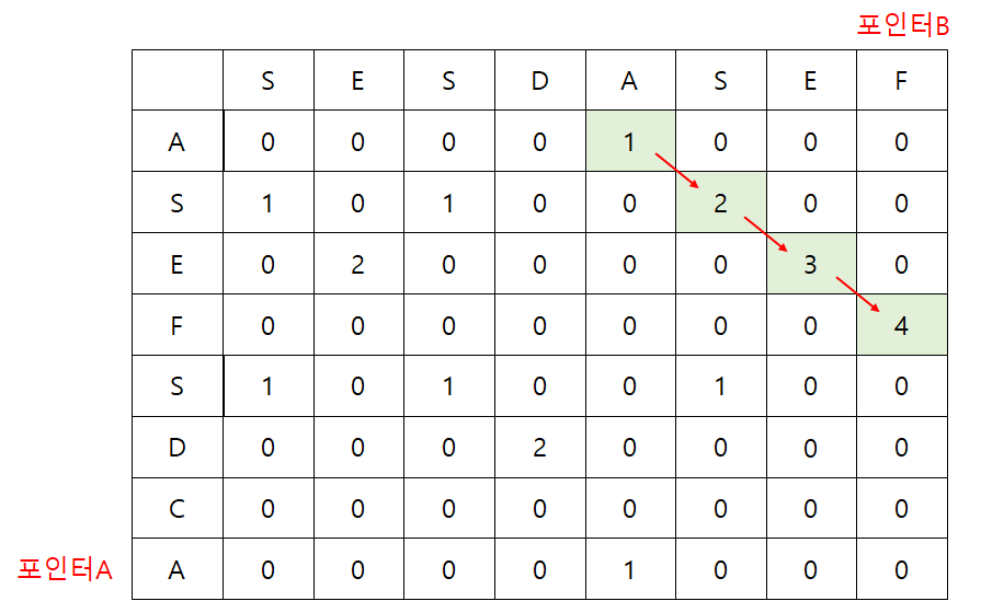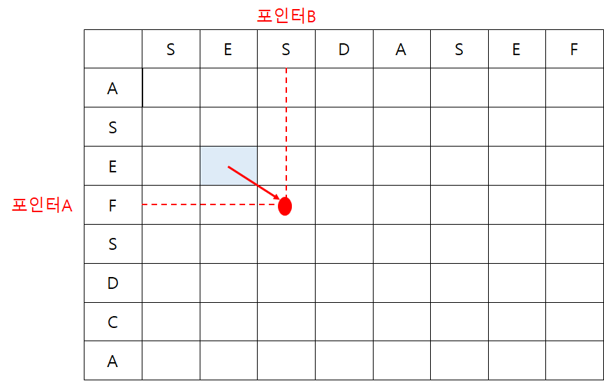 포인터A로 ASE까지 탐색하고 포인터 B로 SE까지 탐색했을 때, 공통된 문자열의 길이는 2이다.